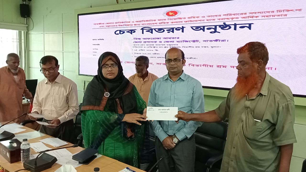 সাতক্ষীরা জেলায় প্রাতিষ্ঠানিক ও অপ্রাতিষ্ঠানিক খাতে নিয়োজিত শ্রমিক ও তাদের পরিবারের সদস্যদের চিকিৎসা ও সন্তানদের উচ্চশিক্ষার জন্য বাংলাদেশ শ্রমিক কল্যাণ ফাউন্ডেশন থেকে বরাদ্দকৃত আর্থিক সহায়তার চেক বিতরণ করা হয়েছে।