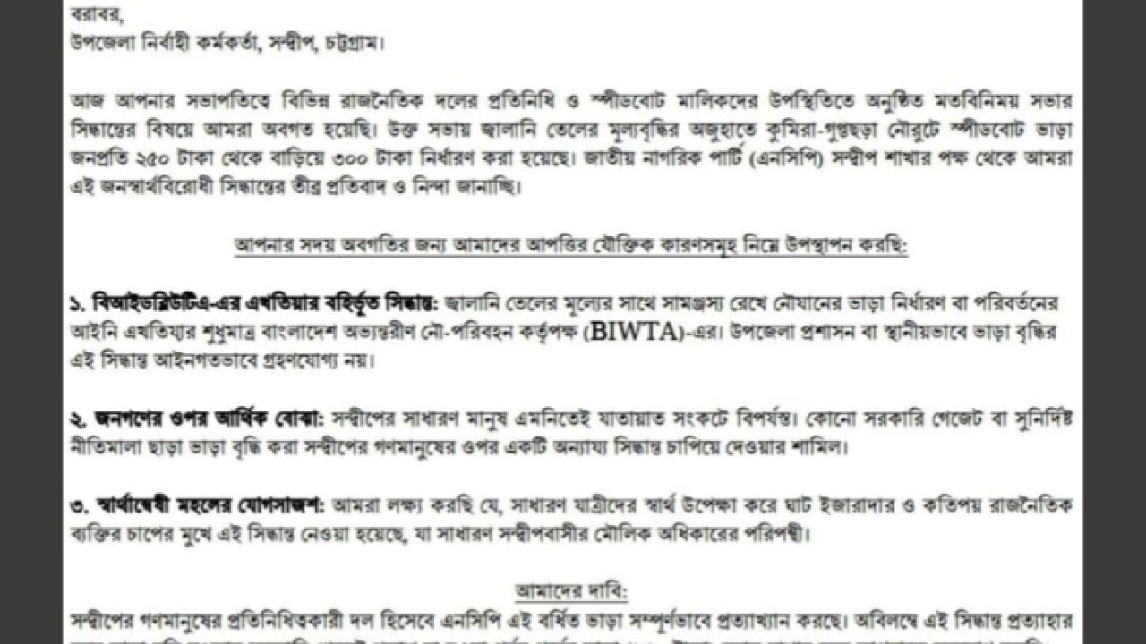 স্মারকলিপিতে বলা হয়, সম্প্রতি উপজেলা প্রশাসনের উপস্থিতিতে রাজনৈতিক প্রতিনিধি ও স্পিডবোট মালিকদের এক সভায় কুমিরা–গুপ্তছড়া রুটে জনপ্রতি ভাড়া ২৫০ টাকা থেকে বাড়িয়ে ৩০০ টাকা নির্ধারণ করা হয়েছে। জ্বালানি তেলের মূল্যবৃদ্ধিকে কারণ দেখানো হলেও এ সিদ্ধান্তকে জনস্বার্থবিরোধী হিসেবে উল্লেখ করেছে এনসিপি।
